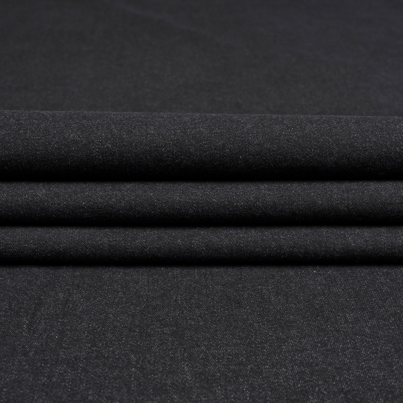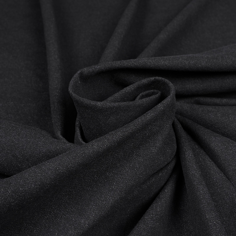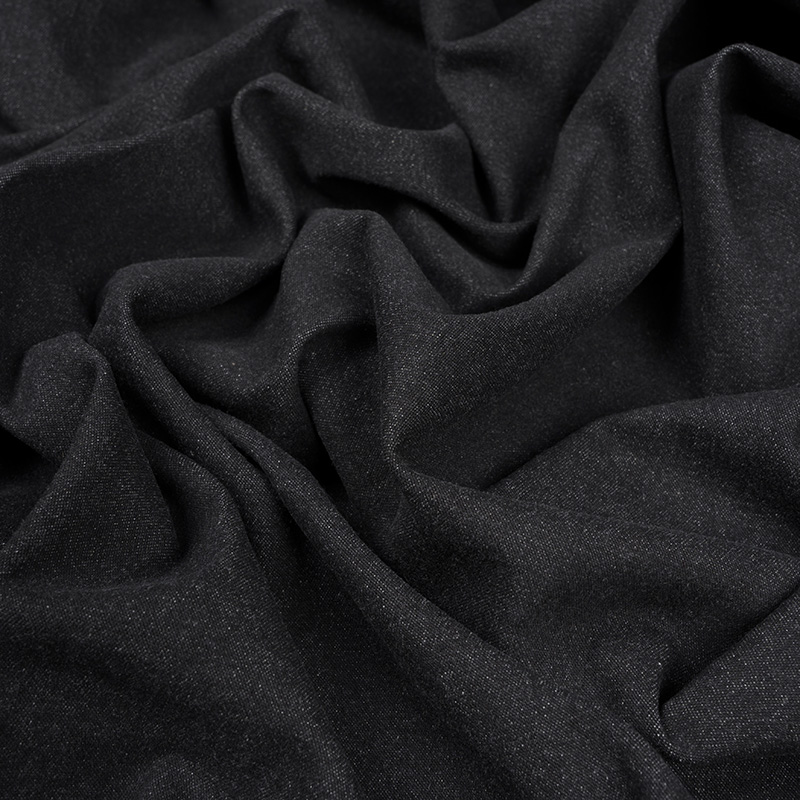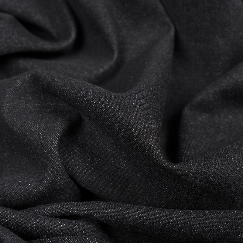 Tkanina ma średnią grubość i miękkie wykończenie, które sprawia, że różni się od sztywnego, tradycyjnego jeansu. Charakterystyczny diagonalny splot typu twill wzmacnia materiał i nadaje mu klasyczny, jeansowy wygląd. Projekty uszyte z tego jeansu prezentują się stylowo, a jednocześnie pozostają komfortowe w codziennym noszeniu. Prezentowany jeans jest w kolorze czarnym.