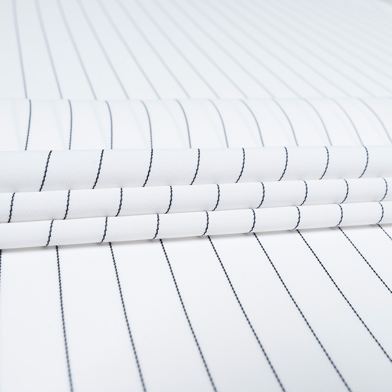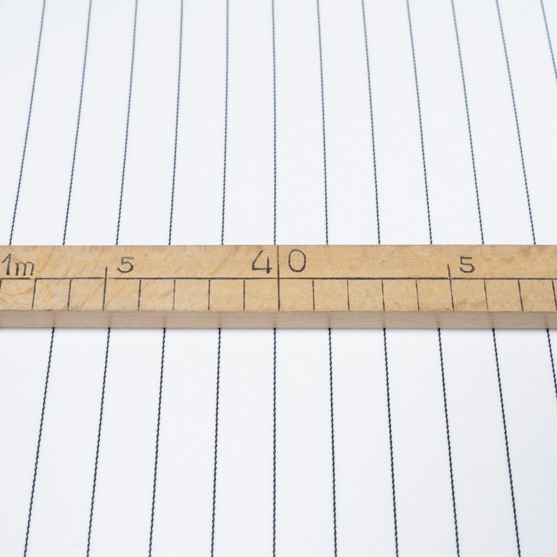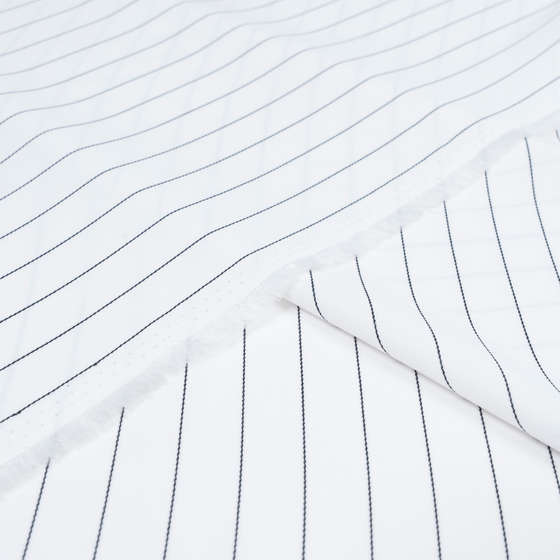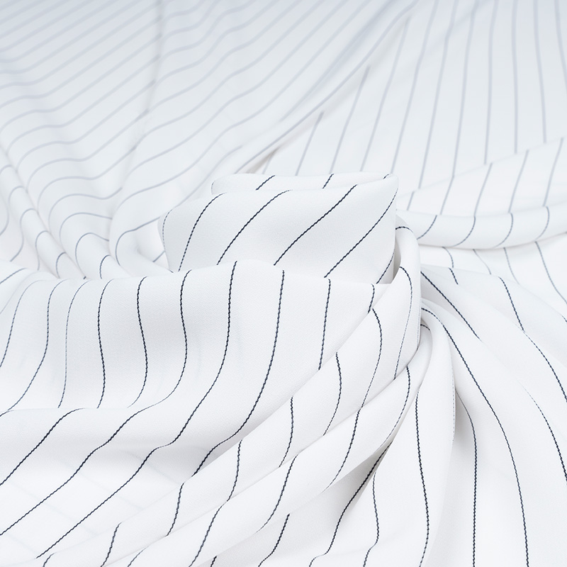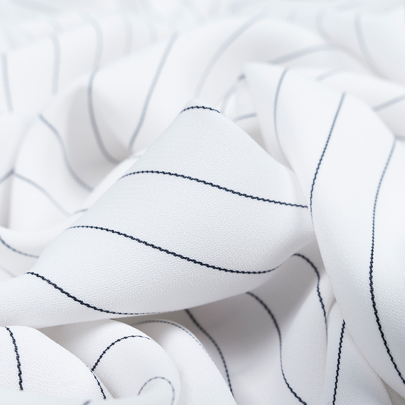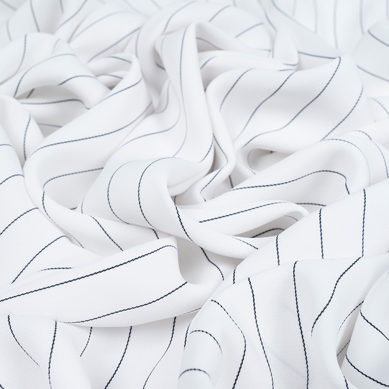 Żorżeta typu krepa w kolorze czystej bieli z eleganckim wzorem w cienkie, czarne prążki. Linia układa się regularnie co około 1,7 cm, tworząc efekt tzw. wzoru tenis. Tkanina ma delikatnie krepowaną, lekko marszczoną powierzchnię charakterystyczną dla krep żorżetowych. Jest cienka, zwiewna i miękka w dotyku, z subtelnym chwytem i lekkim efektem sprężystości. Dzięki swojej lekkości i plastyczności żorżeta idealnie układa się na sylwetce, tworząc elegancki, lekko strukturalny efekt. Materiał świetnie sprawdzi się zarówno w stylizacjach codziennych, jak i bardziej formalnych.
