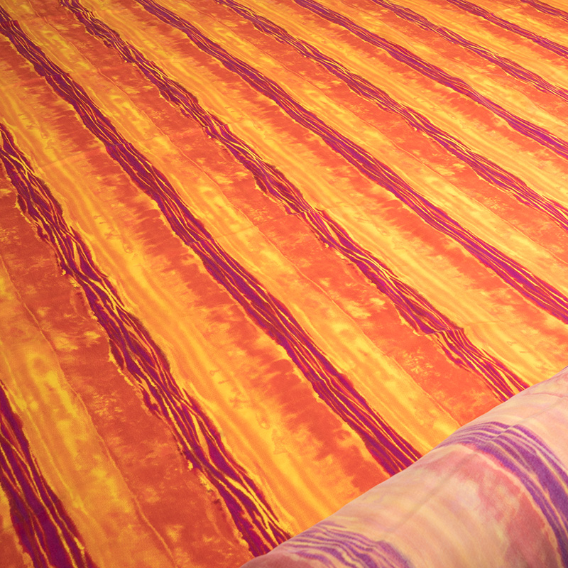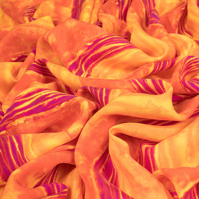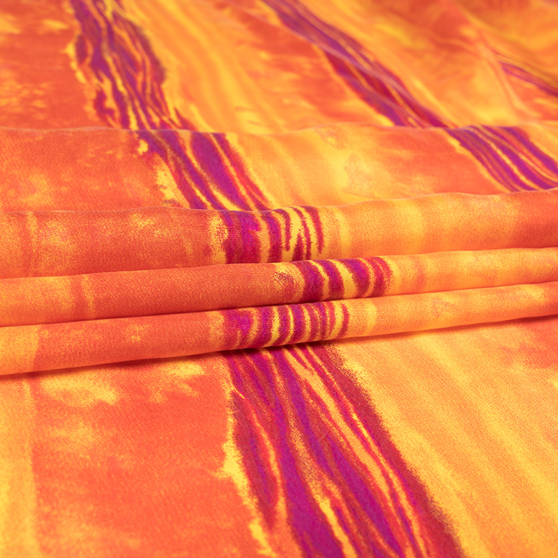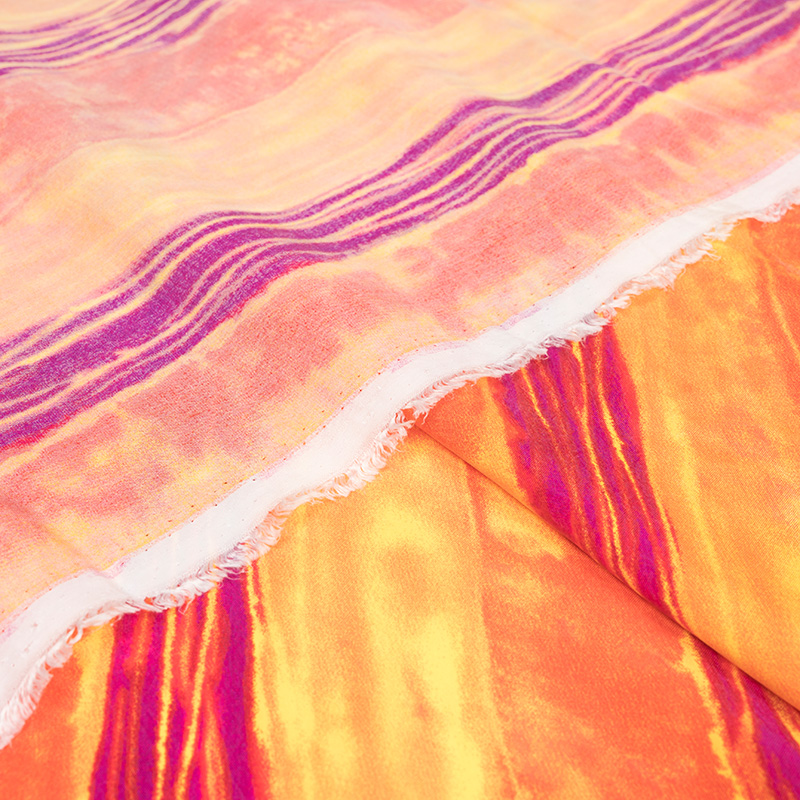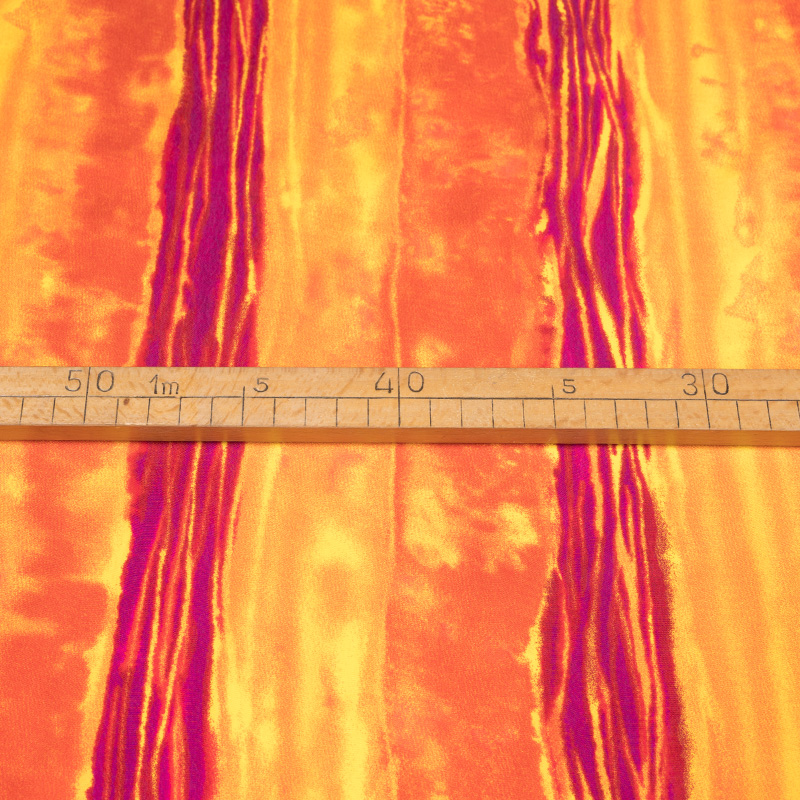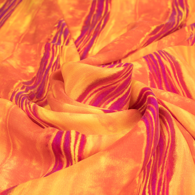 Tkanina naturalna, miękka i przyjemna w dotyku. Materiał idealny na wiosenno-letnią lekką konfekcję. Oferowana wiskoza nadaje się przede wszystkim na sukienki, ale także na letnie kombinezony i luźne cienkie spodnie oraz bluzki. Tkanina jest jednocześnie zwiewna i plastyczna. Tkanina przypomina w dotyku delikatną organiczną bawełnę lub jedwab. Cupro to włókno wytworzone z celulozy, znajdującej się w nasionach bawełny. Jest to tkanina, która tak jak wiskoza powstaje z włókien celulozy, jednak różni się od zwykłej wiskozy w chwycie i innych parametrach. Jest od niej delikatniejsza, bardziej przypomina cienką, organiczną bawełnę. Materiał jest higroskopijny oraz dobrze radzi sobie z przewodzeniem ciepła. Materiał jest bardzo cienki i lejący się. W dotyku przypomina tkaninę jedwabną. Materiały z cupro szczególnie często są wykorzystywane w cienkiej konfekcji takiej jak letnie sukienki, ze względu na bardzo dobrą przepuszczalność powietrza i warunki termoregulacyjne. Prezentowany materiał przedstawia wyjątkowo kolorowy wzór w odcieniach pomarańczy oraz fuksji.
